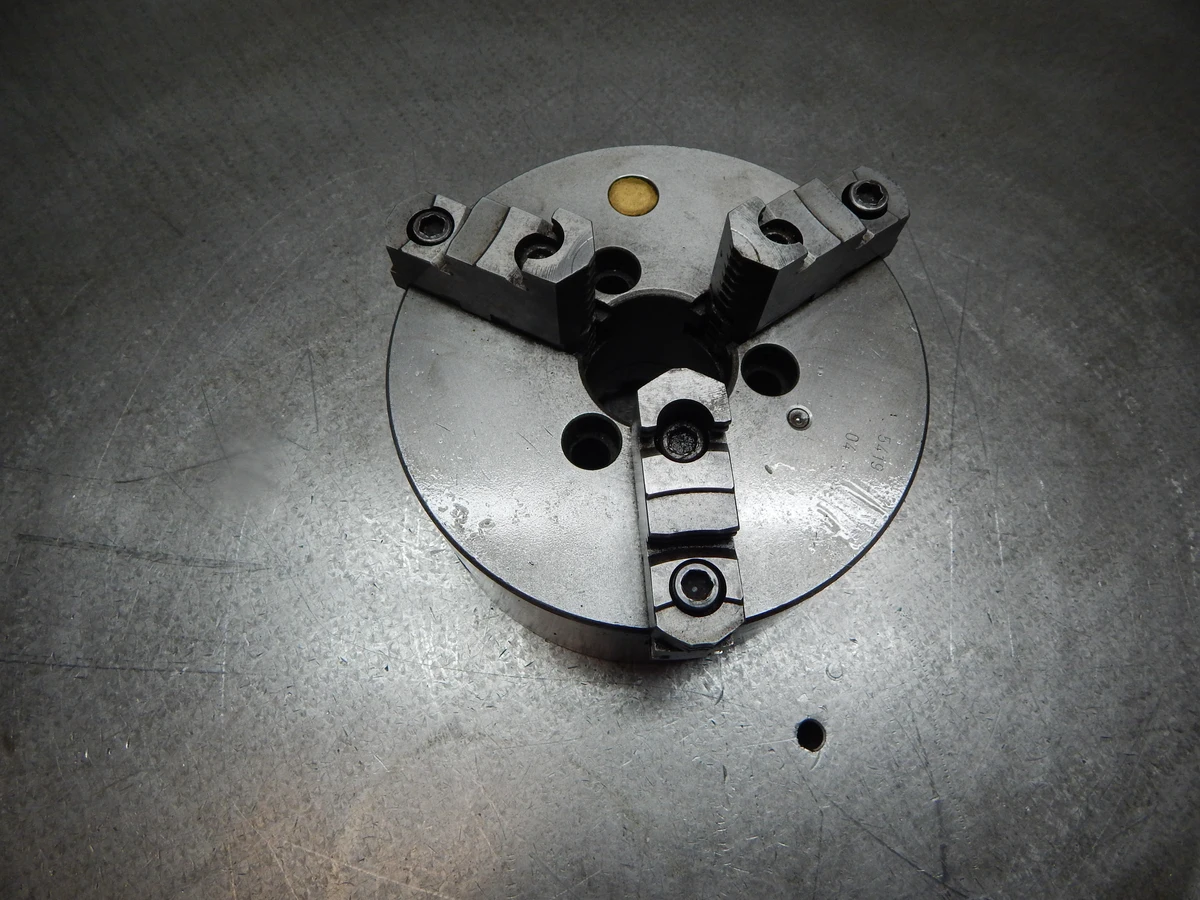 Used BISON 5419-04 3 Jaw Chuck, 7.75" Diameter, 2.25" Bore, Model #5419-04. Manufactured in Poland, this tooling includes three top reversible jaws. Item .