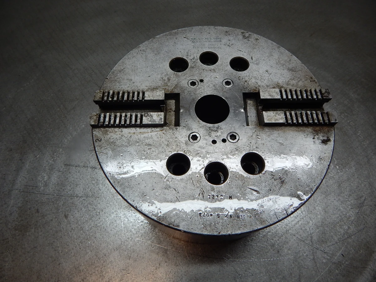 12" S-P MFG. M-3221 Two Jaw Chuck Steel USA . Used tooling in good condition. 12" diameter, 1-3/4" bore, 2 jaws. Reliable S-P MFG. model perfect for diverse machining needs.